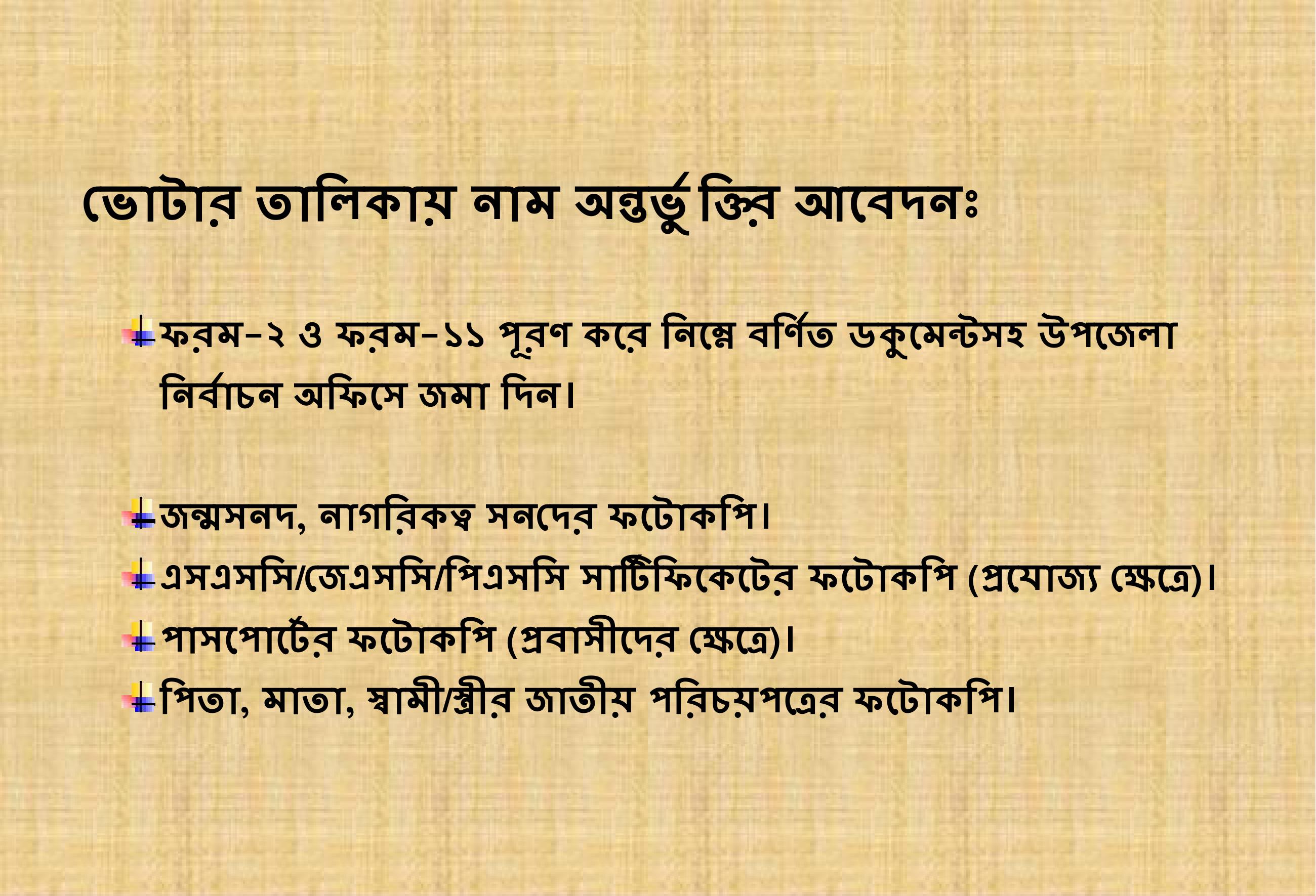 | ৭ | ভোটার তালিকায় নাম অন্তর্ভুক্তির আবেদন | দেখুন | |