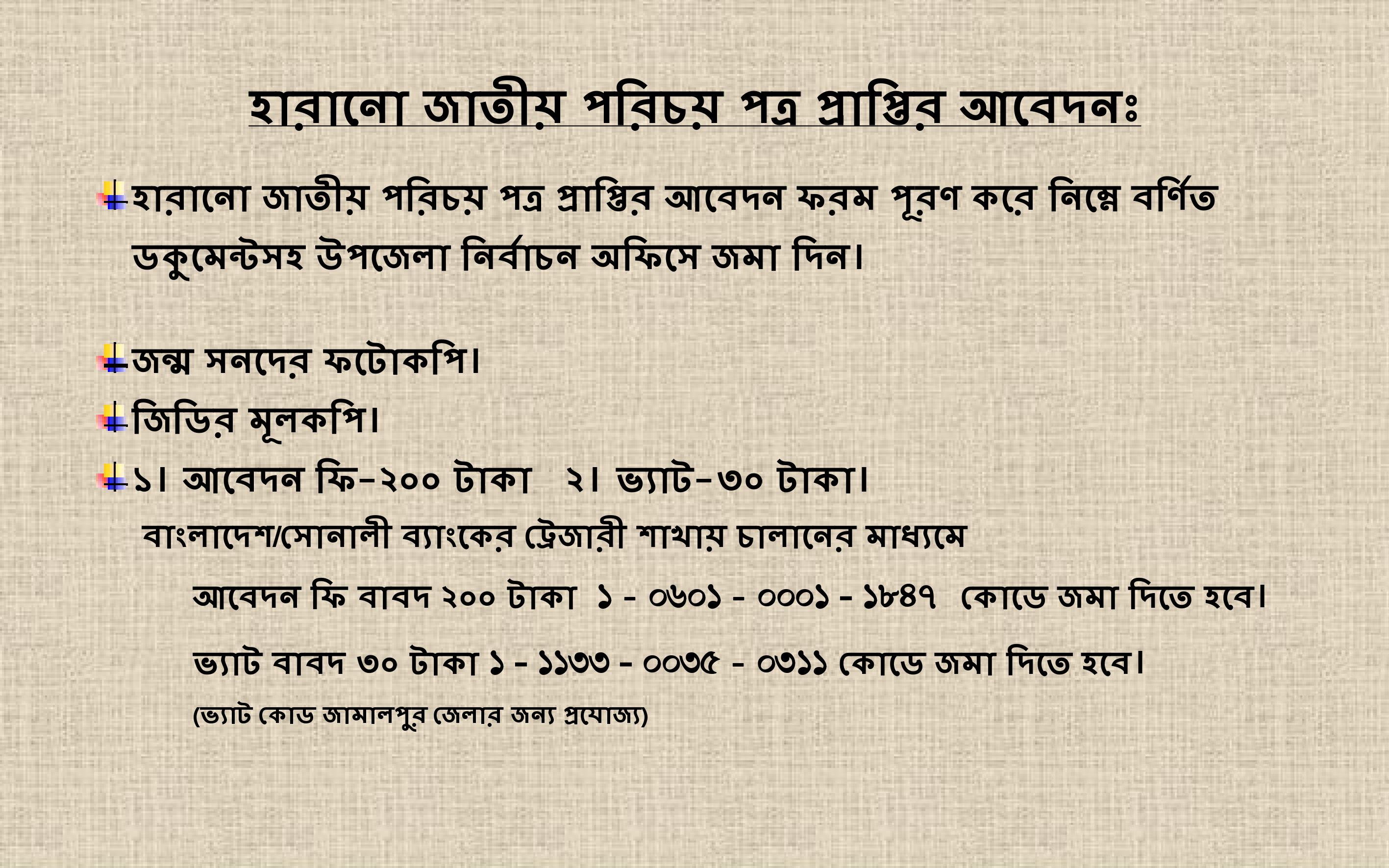| ৪ | হারানো জাতীয় পরিচয় পত্র প্রাপ্তির আবেদন | দেখুন | |