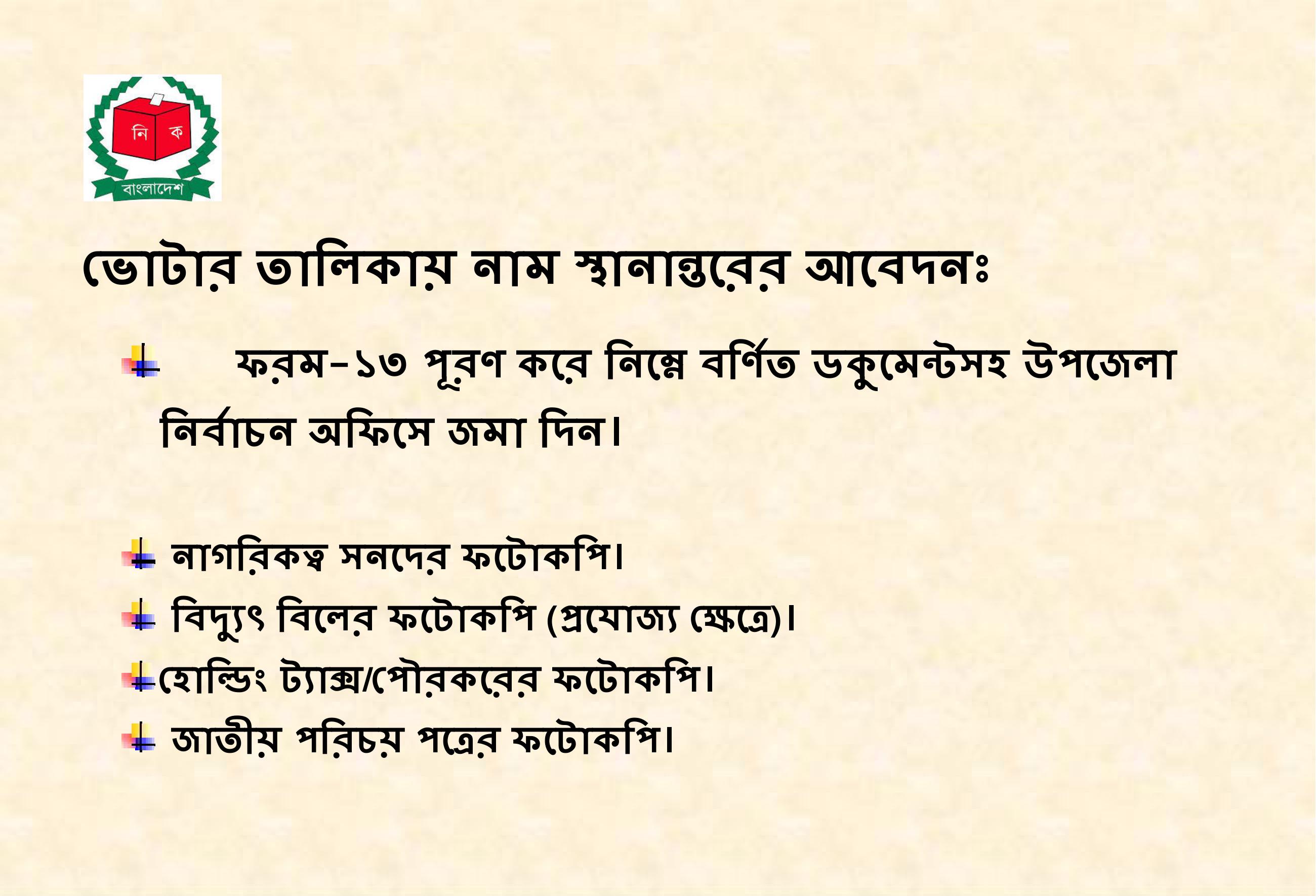 | ১ | ভোটার তালিকায় নাম স্থানান্তরের আবেদন | দেখুন | |